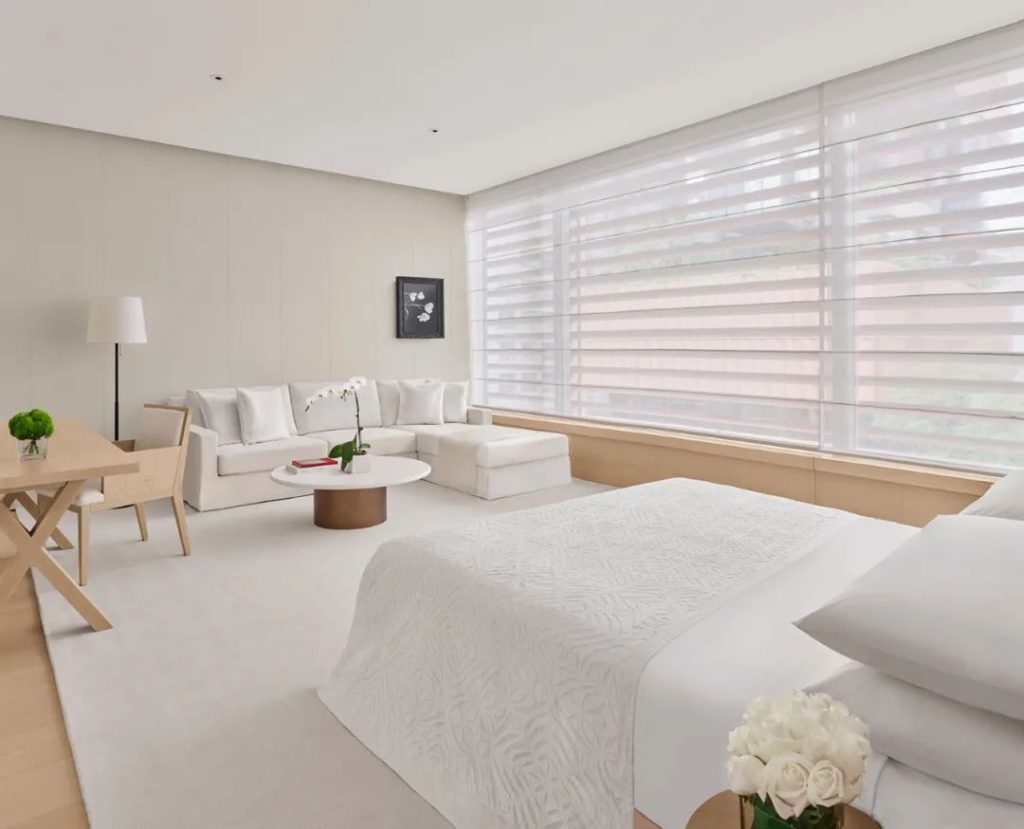 在这里,每一个细节都经过精心设计,定制白橡木地板上都铺有温暖的白色地毯,深座沙发和覆盖床上的手工缝制的锦缎毯子为住客带来居家的气息,窗外花园景观浪漫不已,让人宛如遁入隐居之地。