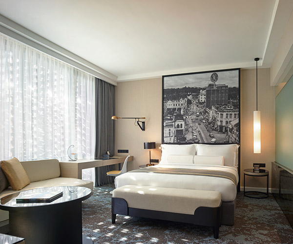 客房则是简洁而不失精致的风格,营造出舒适的居家氛围。床头的吉隆坡旧时代的黑白老照片烘托出浓郁的在地风格和历史感,为客房带来另一种趣味。