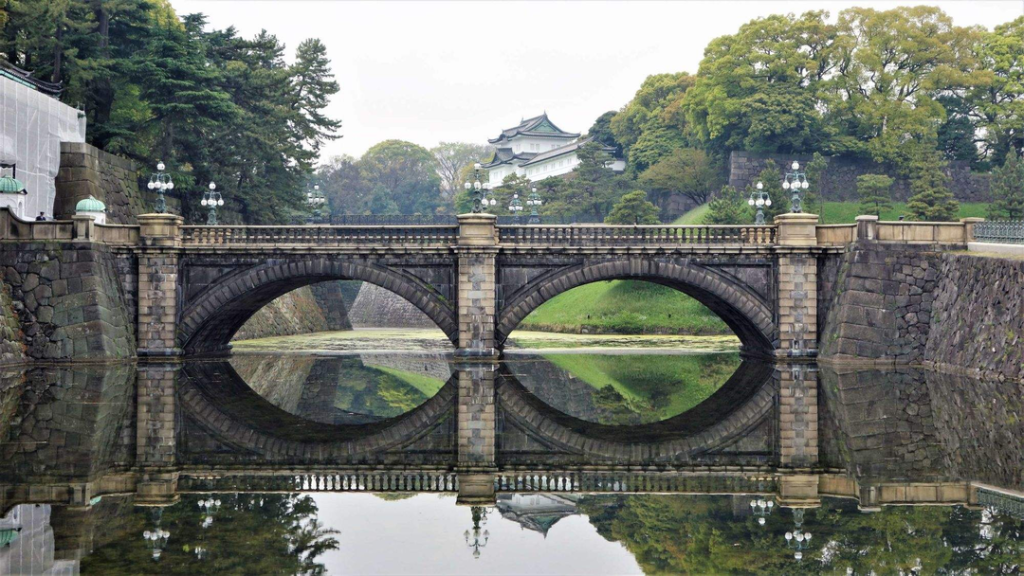 从皇居前方的广场望向宫殿方向,可以看见石造的“正门石桥”与后面铁造的“正门铁桥”两座桥,但“二重桥”其实是指后方正门铁桥,因护城河水深,旧桥较低,所以在桥上又搭了一座桥,称为二重桥。二重桥下的护城河被认为是皇居很美的地方,倒映着垂柳和二重桥,水面十分平静,桥洞下长满了苔藓,更是增添了一丝历史感和宁静感。