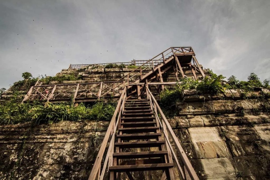 这里的金字塔,风格不同于其他所有的吴哥古寺,更偏向于玛雅金字塔的风格,隐于密林之中,已布满岁月青苔,拾级而上,可尽览周围风光。