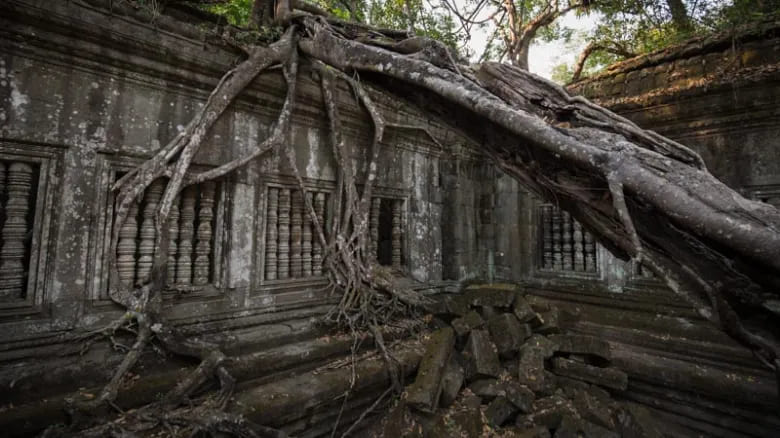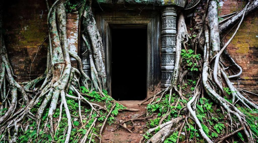 这里最大的特色是古迹上都被参天巨木盘结,树根深入石缝中,寺中有树,树中有寺,自然和人文完美结合,形成奇特的画面。