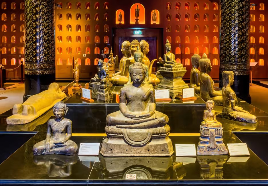 金边国家博物馆将高棉传统建筑与法国殖民风格相结合,整体呈红色。博物馆目前约有15000件藏品,每次固定陈列展出约2000件作品。馆内藏品丰富,跨越了不同的历史时期,既包括史前阶段,也包括吴哥朝代早、中、晚期等不同阶段的文物,主要为石器、青铜器、瓷器及木器这四类展品。