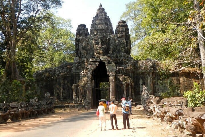 吴哥城,即「通王城」,位于吴哥寺北面。1181年,吴哥王朝最著名的统治者之一阇耶跋摩七世登基为王。他重建了吴哥城,建造了高大的城墙和宽阔的护城河,许多宏伟的庙宇也拔地而起。