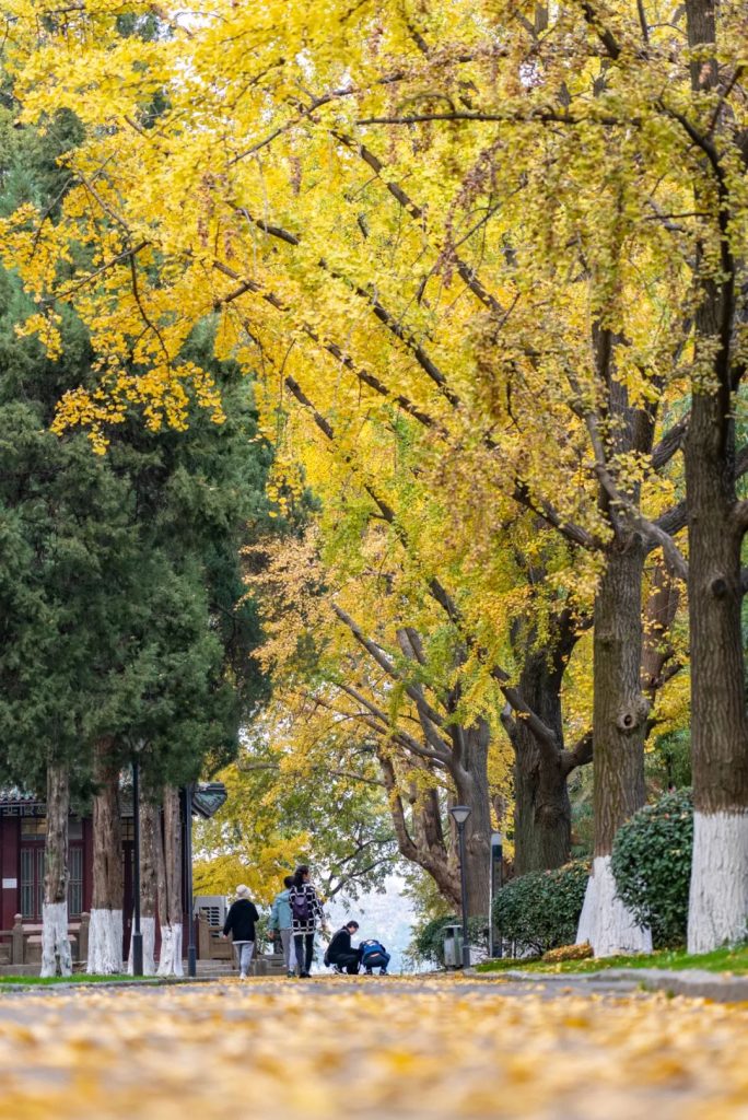 人们从满眼葱绿等到遍地金黄,看着铺天盖地的银杏,染黄了朱楼。透过叶隙,与青色屋脊上的神兽,打个照面。
