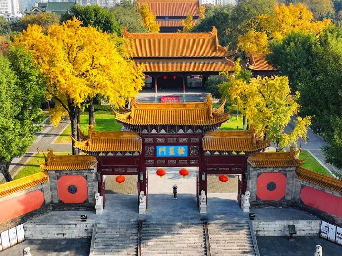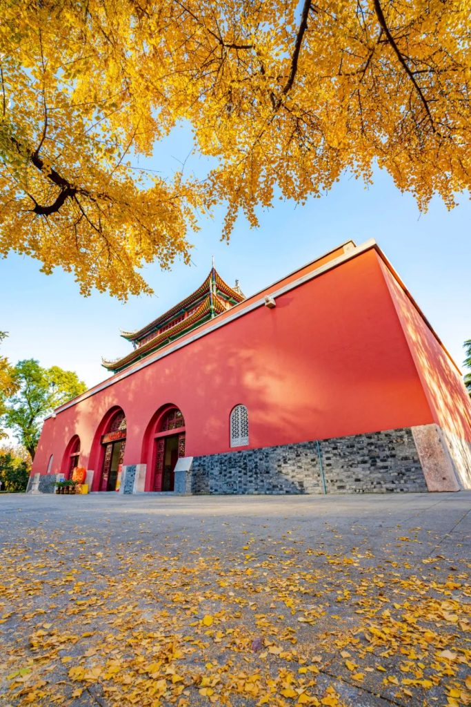 漫天飞舞的银杏叶如同金色的蝴蝶,从红墙金瓦之间,随着厚重的历史感缓缓飘落,“金陵第一胜迹”的画面感迎面而来。