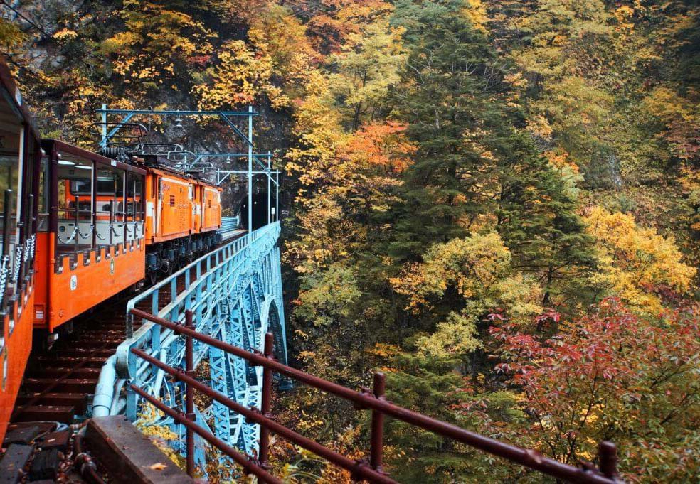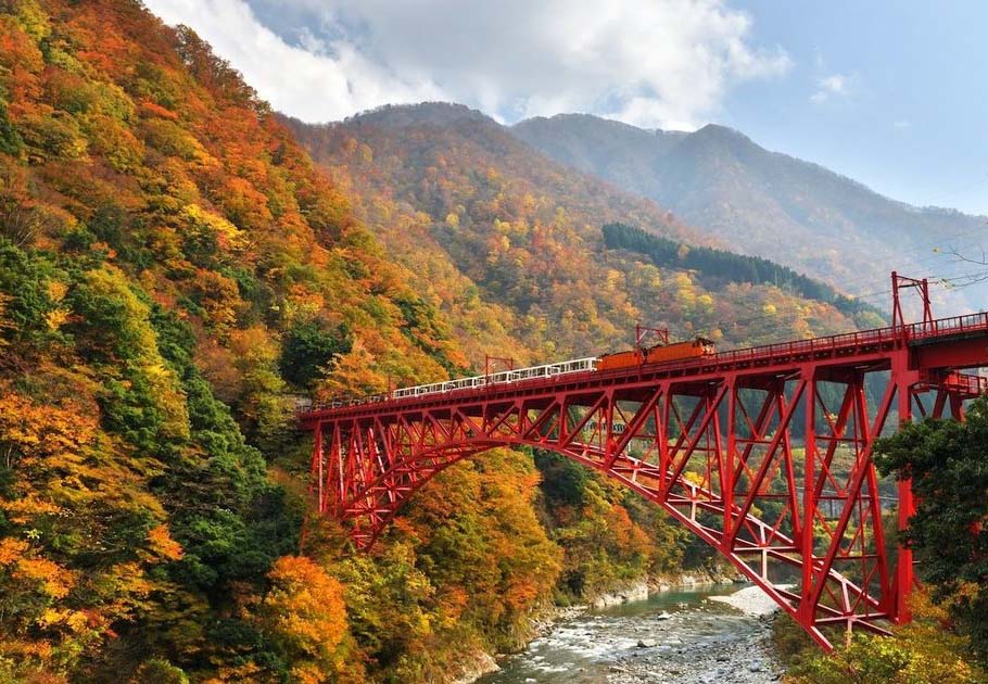 日本黑部峡谷铁道在秋天是最佳观赏的季节,此时山巅和森林都被一片橙色覆盖。乘坐从宇奈月到欅平站的风景优美的火车,你可以欣赏到横跨黑部川的奥金桥周围的峡谷和山脉美景。