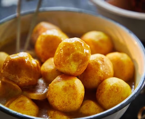 在新马路的公交站旁,有个推着小推车的阿伯,卖了 20 年的咖喱鱼蛋 —— 不锈钢锅里的咖喱汁咕嘟冒泡,鱼蛋在里面滚得金黄,路过的人都会停下脚步。要一份咖喱鱼蛋(5 颗) ,5 澳门元就能到手,阿伯会用竹签串好递给你。咬下去第一口是 “Q 弹”,牙齿要稍微用力才能咬破,里面的鱼肉很嫩,咖喱汁裹在外面,咸香中带着一点辣,吃完还想舔竹签;如果能吃辣,让阿伯多浇一勺 “秘制辣油”,辣得过瘾又不烧胃。小技巧:阿伯的推车上午 10 点才出摊,下午 3 点就收,想吃要赶早,最好现金支付,找零方便。