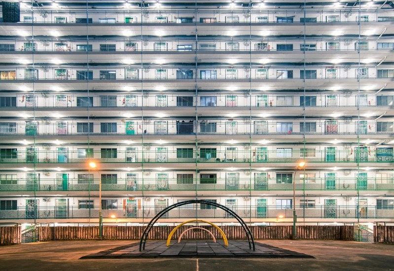 它有一块三面被大厦围绕着的平台空地,空地里有两个旧式儿童游乐场,是摄影者最喜爱的拍摄点,雨后地面有积水的时候则是最佳的拍摄时机。