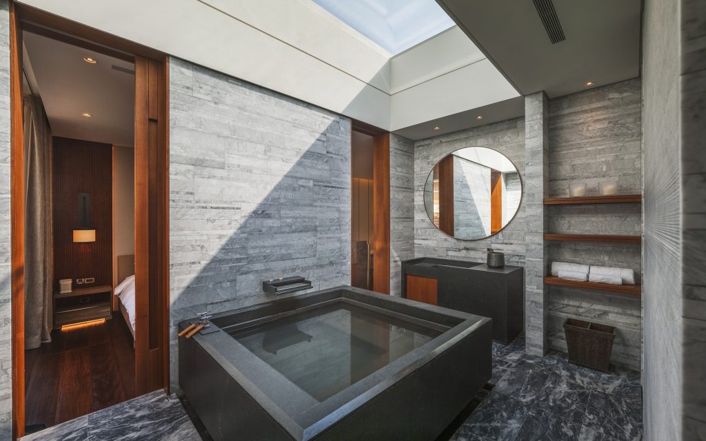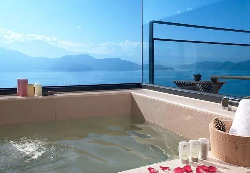 拥有日月潭绝景的云品温泉酒店,除了亲水主题馆,还有大众汤的烟岚风吕,分为男汤、女汤,规划有方形温泉池、圆形冷水池、方形温水池。