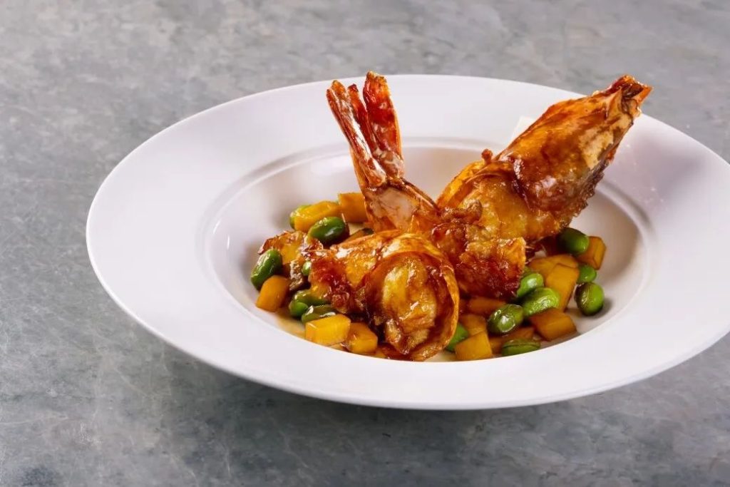 之后更有以秘制沪式酱油爆炒爽嫩弹牙的沪式酱油大虎虾,以及酥脆的黄鱼茸脆皮花胶和爽口弹牙的紫苏鲍鱼炒鸽脯。