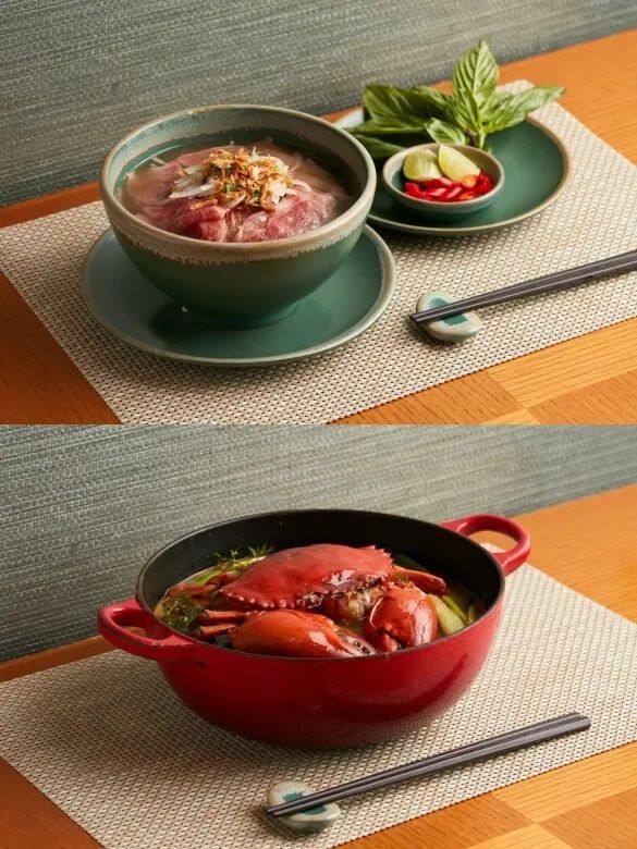 在主餐牌中可以看到不少新菜式,包括牛百叶沙律、软壳蟹牛油果米纸卷、酥炸龙脷鱼柳滨海、越式蟹汤锅、椒盐大头虾、法越烧乳鸽、日本 A4 和牛汤河粉等。