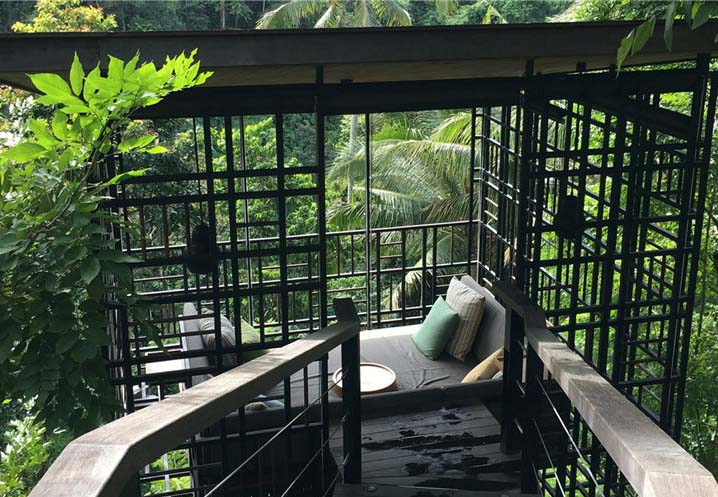 该酒店两大特色:横空出世的森林「鸟笼」发呆亭,日本文化与巴厘岛的和谐共生。
