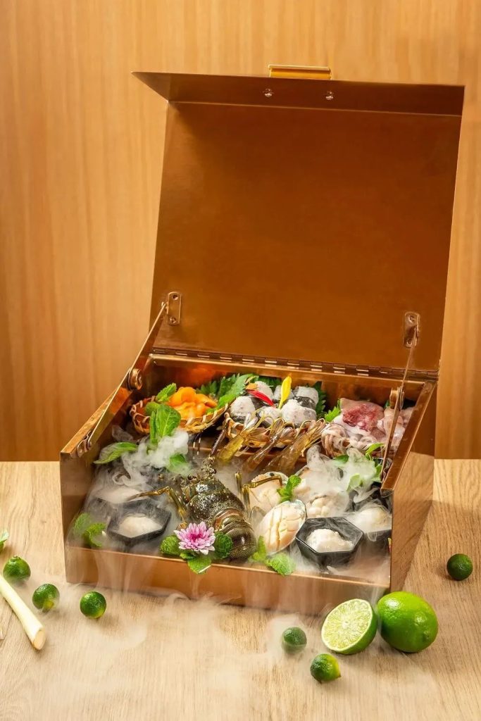 卖相惊艳夺人的手工金盒,犹如在海洋深处的神秘宝箱,客人打开手工金盒,随即会有烟雾四散的视觉效果,然后多款海洋瑰宝均以华丽姿态逐一示人,例如:鲜活鲍鱼仔、生猛海虾、蚌和墨鱼丸等都是本地的优质生猛海鲜。