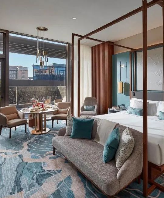由HBA操刀室内设计,以孔雀蓝与灰自搭配,配置木质及金属元素,流露出低调的中式奢华!仅有73间客房,但间间都是精品,处处彰显匠心。55平米起的房间极为宽敞,部分可以直接看到紫禁城的绝美风光。设计独特的四柱床、八角桌,中式意味十足。