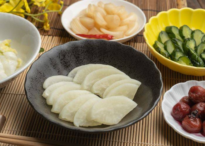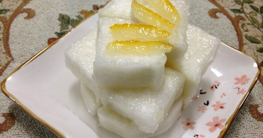 在日式家常餐桌上,腌菜虽是配角,却极其常见。众多种类中,甜糯萝卜腌菜(べったら漬け)尤为知名。它是将盐渍过的白萝卜,再用以甜酒为主的米麴腌制而成。因此,不像使用黄色泽的“沢庵”(腌黄萝卜),而是保持了萝卜原本的白色。
