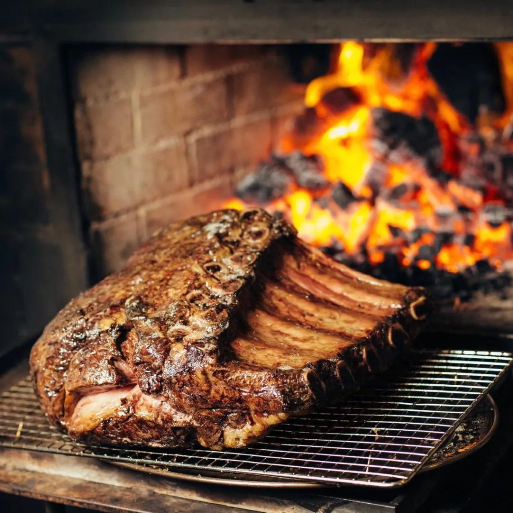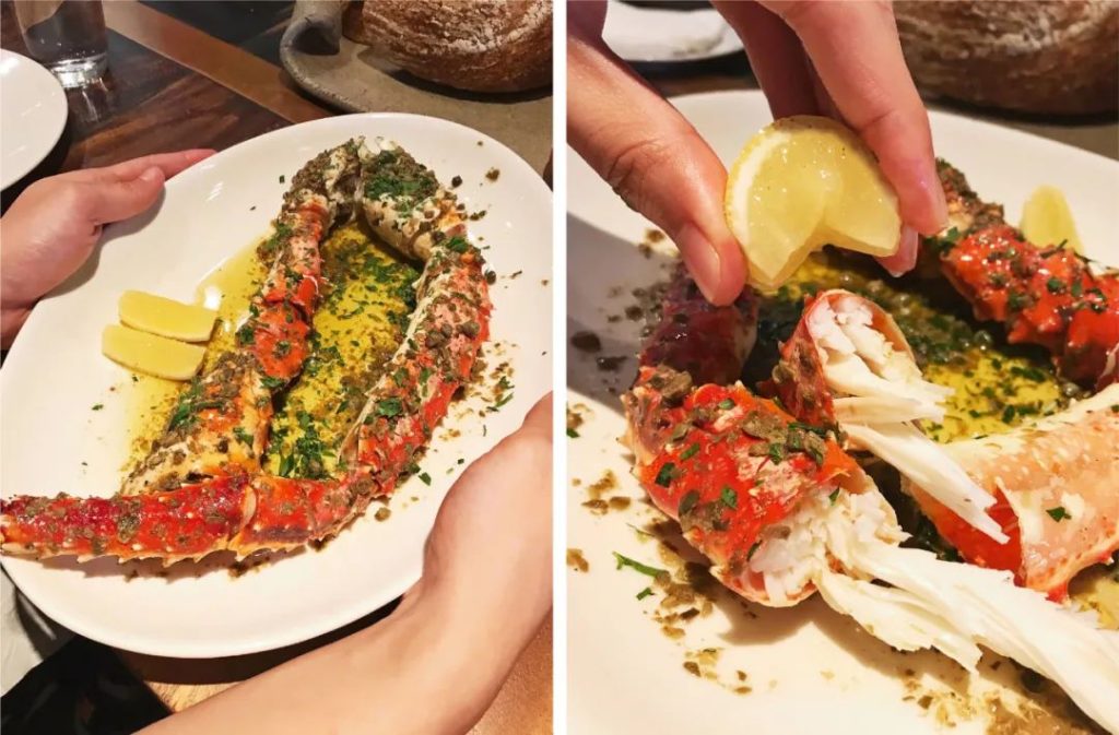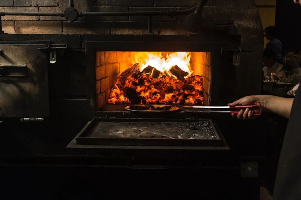 燃烧着苹果木和杏仁木的四吨中大铁炉是餐厅的C位,然后就是没有烟熏火燎的开放式厨房。看着厨师们热热闹闹地在对面做菜,烧烤的香气直往鼻孔里钻。