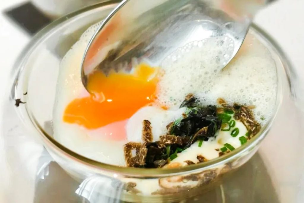 主厨Julien Royer在新加坡另一家米其林二星法餐厅Jaan崭露头角时发明的招牌菜,65度低温慢煮蛋。放在鸡蛋盒里端上桌,干冰营造出仙气萦绕,双层玻璃杯底溢出炙烤迷迭香的草本芬芳。敲开一颗蛋,半凝固的蛋黄与土豆、荞麦、伊比利亚火腿拌着吃,实现五感的多重享受。