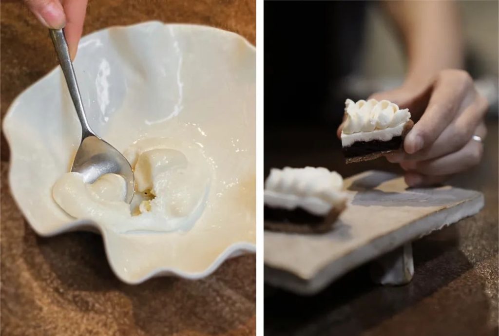 山羊奶酪棉花糖配高良姜冰淇淋和洋葱酱啫喱,微妙的辛辣去除羊膻味,非常刺激的重口味。另一道酸甜的甜品,是发酵黑蒜和澳洲车厘子制成的挞,回味带有麦芽糖的甜和醋酸。