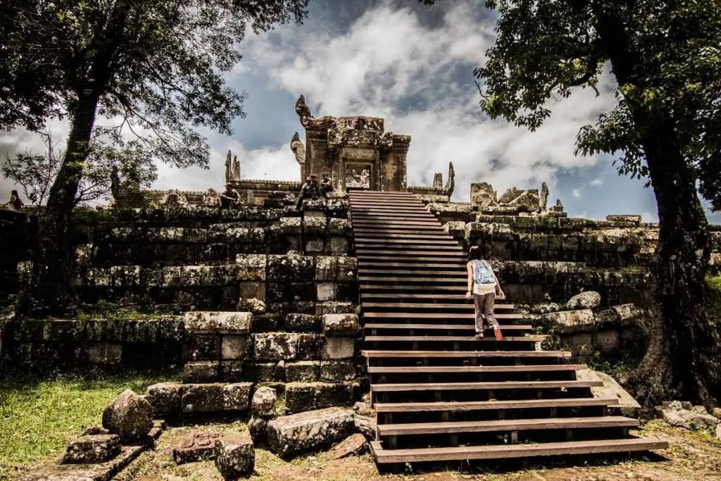 柏威夏寺耸立于柬泰边境的扁担山脉悬崖边,是高棉帝国于9世纪开始建造12世纪竣工的柬埔寨风景最壮观,海拔最高,比吴哥窟历史更悠远的古寺庙,在2008年被列为世界文化遗产。