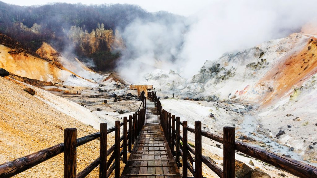 地狱谷是登别温泉的泉源,也是一个火山喷发的遗址,至今还在不断掀起热气、散发着浓烈的硫磺味,简直是一幅地狱中的景象,因此而得名。
