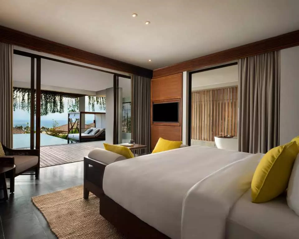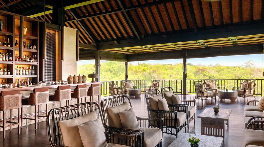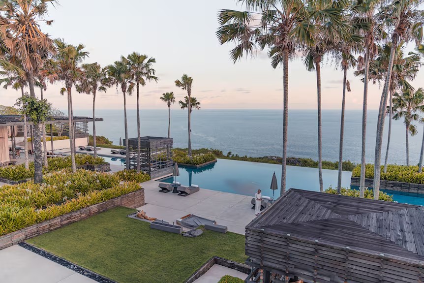 酒店整体建筑由国际知名设计团队操刀,融合当地传统巴厘元素与现代极简美学:石墙、木梁、茅草屋顶与天然材料在空间中随处可见。每一间别墅都设有私人泳池和户外起居区,让住客在静谧私密中亲近自然。Cliff Bar 酒吧坐落在悬崖上,可欣赏印度洋上空的广阔景色,提供新鲜出炉的地中海风味特色菜,如传统披萨和自制意大利面。这里的饮料也值得一提:试试我们的自制康普茶、椰林飘香、棕榈泥或椰林飘香。