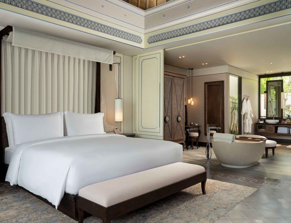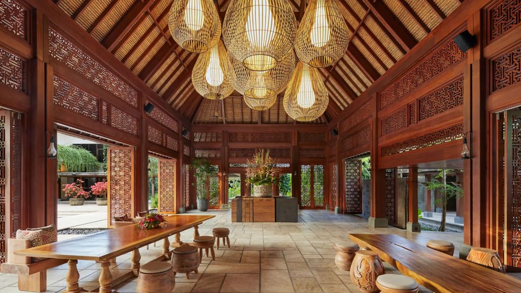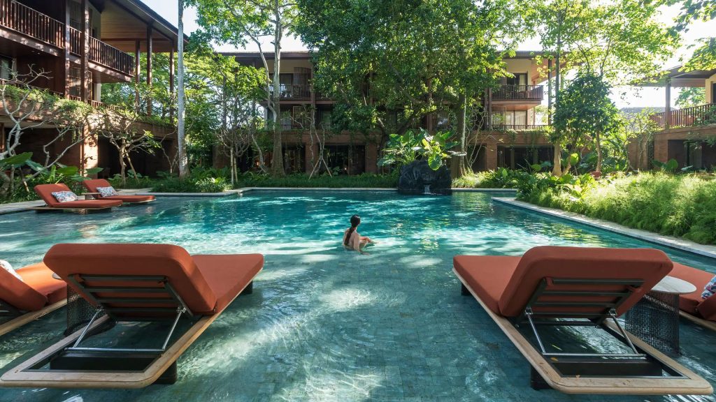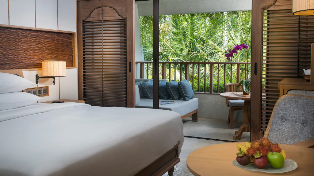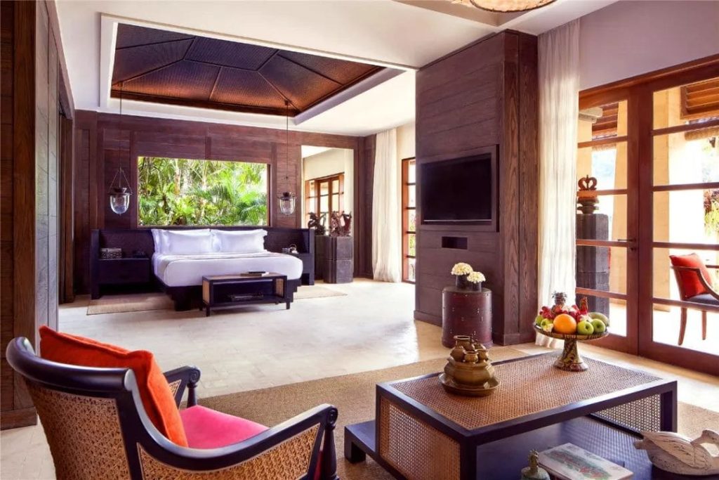 酒店由来自曼谷的Tierra设计和东京的Spin设计工作室操刀;其拥有149间客房,包括分布在一系列庭院中的18套花园别墅和4套海滩别墅,为客人在度假酒店穿梭时营造了探索之感。客房,套房和别墅的面积从66m²起,采用当代巴厘式风格设计,并使用如竹子,安山岩,大理石和柚木等当地建筑材料制成。每间客房都有一个私人阳台,可俯瞰花园,海洋或泻湖。距海滩仅几步之遥的2卧海滩别墅每套均为578m²,均设有绿意盎然的户外露台,可进行私密聚会及烧烤,同时设有宽敞的客厅,泳池和别墅入住手续。
