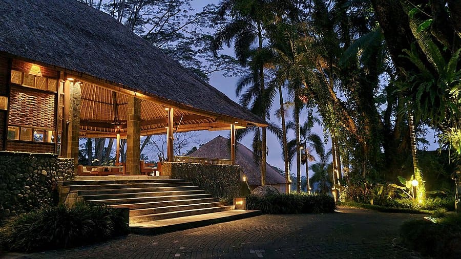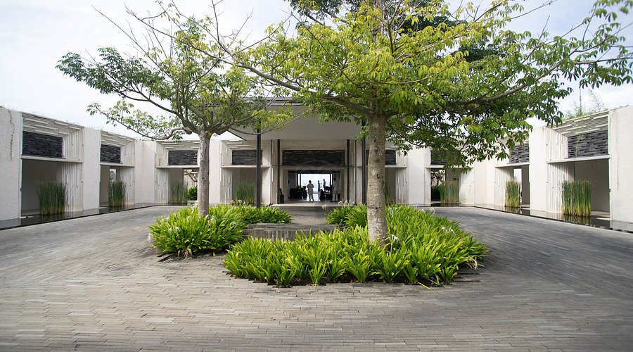 在通往大堂的路上,一棵巨大的佛教圣树菩提迎候宾客前来。它的后面是一个迷人的花园。这棵树已经有120岁。在满者伯夷王朝,菩提树被认为能够唤醒灵性,通常栽种于皇家建筑和宗教建筑的入口处。围绕其四周的庭院里,立着一个 pendopo 式样的爪哇传统圆柱方亭,搭配一众古树和多处水景,营造出一种宁静的感觉,为远道而来的宾客提供了一个放松休息的理想环境。脚下一望无际的印度洋景色,令人身心的疲乏消解一空。