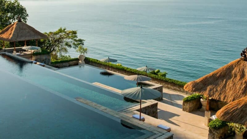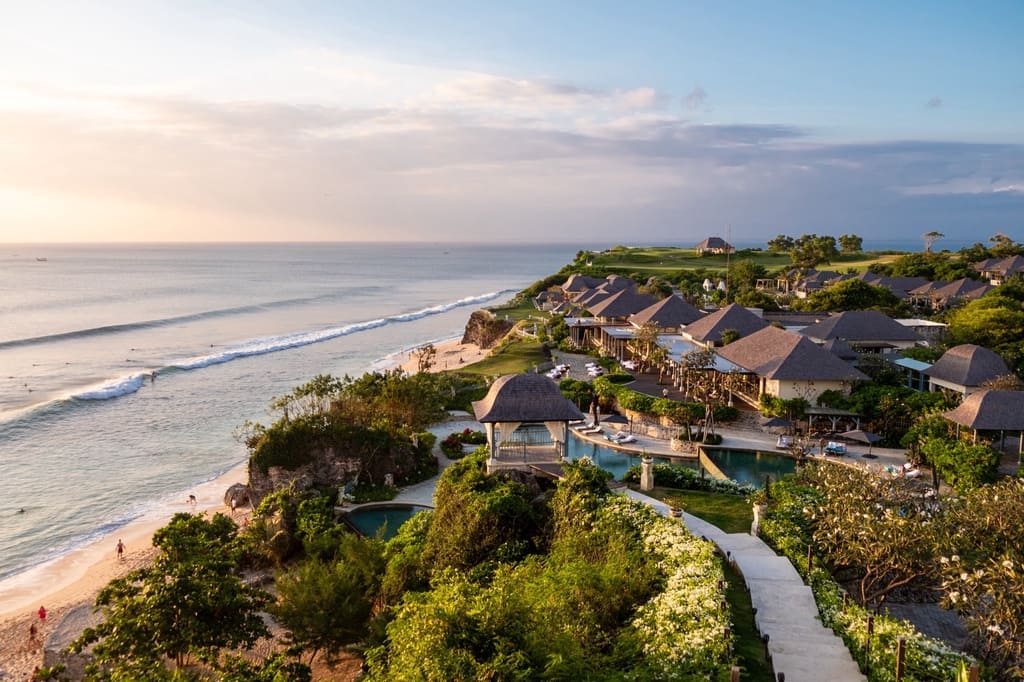 巴厘岛宝格丽度假村位于金巴兰半岛南端乌鲁瓦图附近一片僻静的高原上,海拔 150 米。度假村由急剧下降到印度洋的悬崖定义,享有日出和壮观的日落美景,可通过缆车私人进入一片原始的海滩。