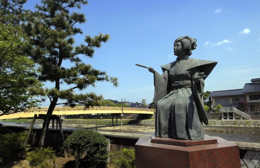 古色古香的花街木桥,仅供行人使用。穿过梅之桥右转,可以看见一条镜花之道,竖立着「泷之白糸」碑和雕像,这是日本作家泉镜花的《义血侠血》改编舞台剧的女主角。