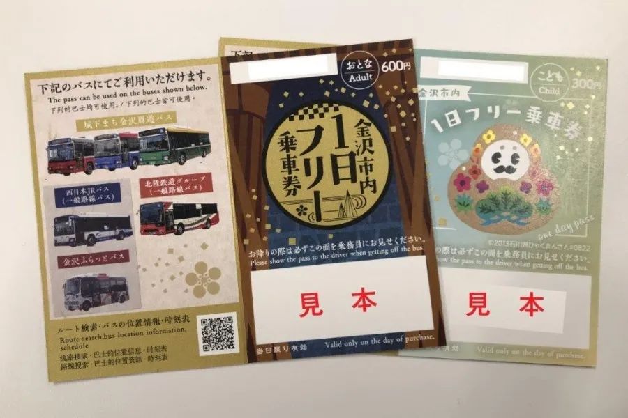 成人票200日元,儿童半价。如果打算按照固定路线观光,大家直接购买一日票比较划算,成人600日元,儿童半价。你可以在一天内无限次搭乘金泽市中心指定区域内的城下町金泽观光巴士、金泽巴士、固定路线巴士等。后门上车,前门下车,下车时付现金或出示一日票。
