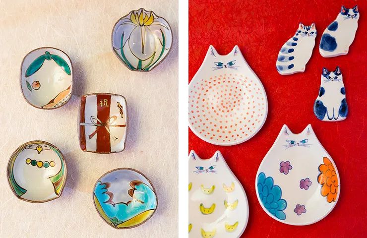 例如用加贺友禅和服面料制作的贴花和用古董和服面料制成的贴画小袋;娇小可爱、造型精美的加贺顶针;用彩线一针一线缝制而成的加贺手鞠;拥有360年历史的九谷烧,近年来,很多年轻人开始制作九谷烧,作品十分新颖。