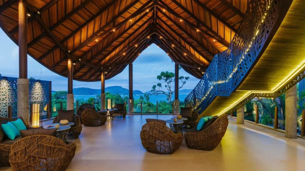 酒店是全亚洲位置最高的岛屿酒店,宽敞的客房均可俯瞰攀牙湾,所有泳池别墅和套房都采用「茅草顶篷」,仿佛置身于热带丛林中的豪华树屋一般。酒店内自然植被和繁盛的草木覆盖,令每栋高楼别墅之间互不干扰,保证充足的隐私。
