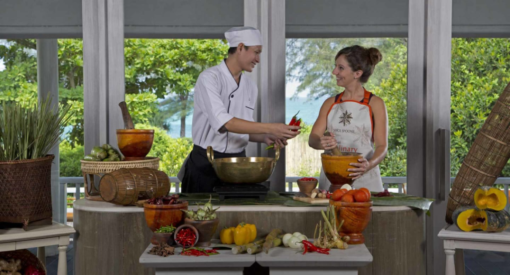 酒店内的陆上活动,可以在调羹烹饪课上,探寻泰国著名美食文化背后的故事;学习几句实用的泰语;跟随葡萄酒大师学习品酒法则;在设施一流的18洞高尔夫球场肆意挥杆;小朋友们则可以在小象俱乐部体验蜡染、泰拳、烤棉花糖,让父母拥有属于二人的安闲时光。