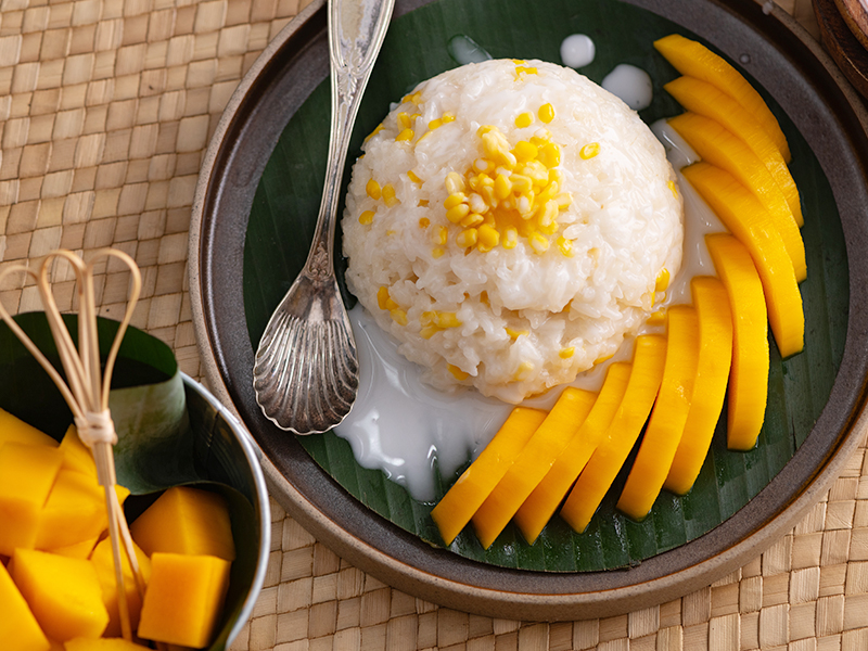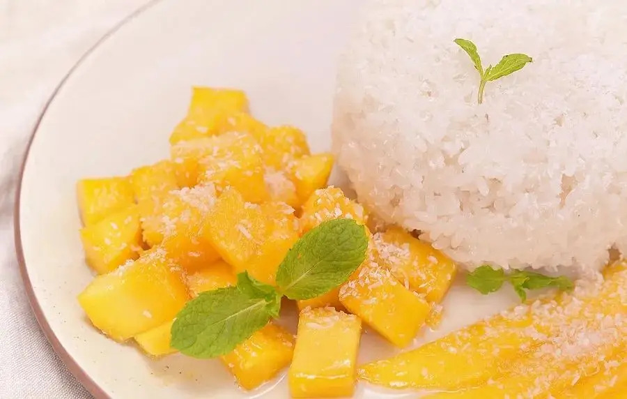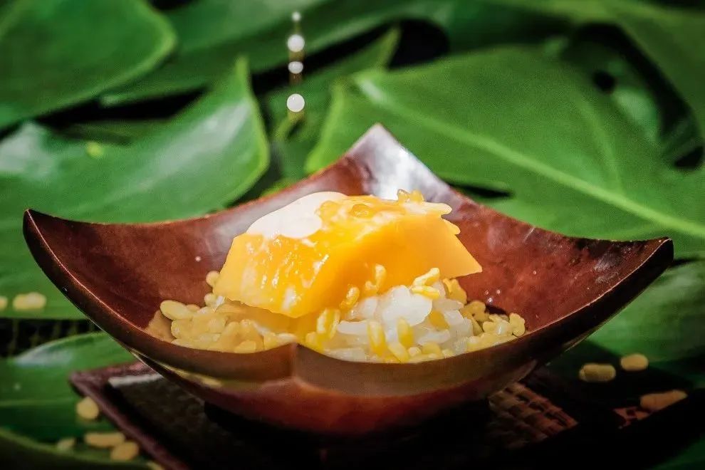 芒果糯米饭是一道经典的泰国甜品。芒果甜中带点酸,可在转瞬间被软、黏、韧的泰国椰香糯米饭的甜味融化掉一一椰浆、糯米饭的甜蜜与芒果的清香,在嘴里悠悠地融化开来一一心也要化了哦。