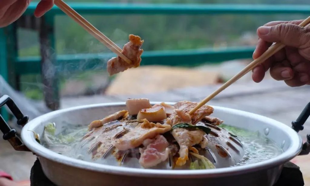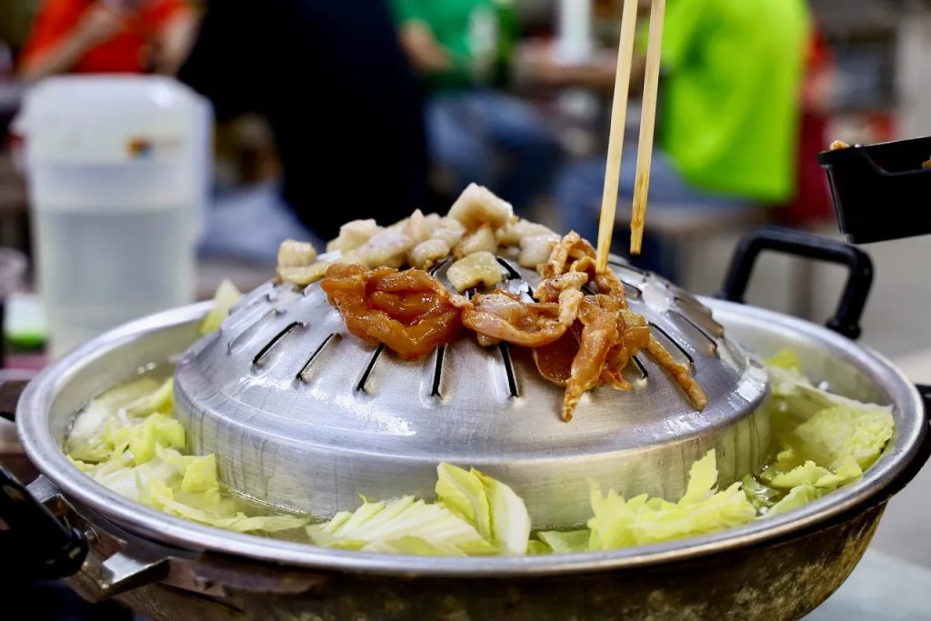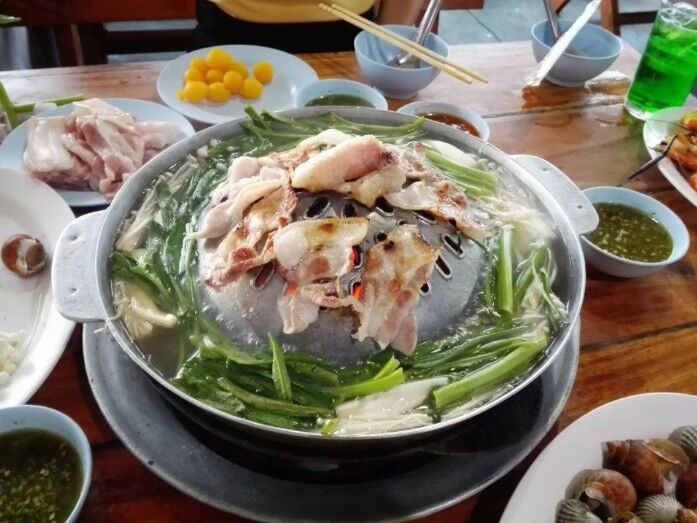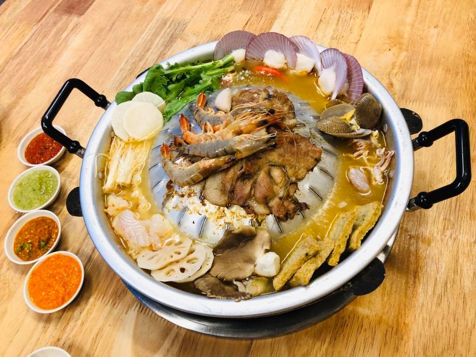 泰式烤肉火锅独特,中间烤肉周边涮,肉汁流入锅底增鲜,一锅双味超满足。汤底酸辣,含天然香料,也有清淡口味。烤盘可烤肉类菌类,尤其水产,烧烤后鲜香四溢!