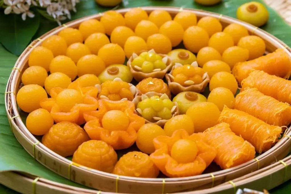 泰国文化中,黄色或金色寓意着吉祥富贵,而“黄金三宝”正是泰国最具传统文化色彩的甜品。这几款甜品都需精湛技艺方可制成,普通集市上就有卖,也是重大节庆典礼上必备甜品,互赠亲朋挚友,而甜蛋丝更是婚礼必备,切食用时不可剪切,丝缕缠绕意寓新婚燕尔天长地久,百年好合。