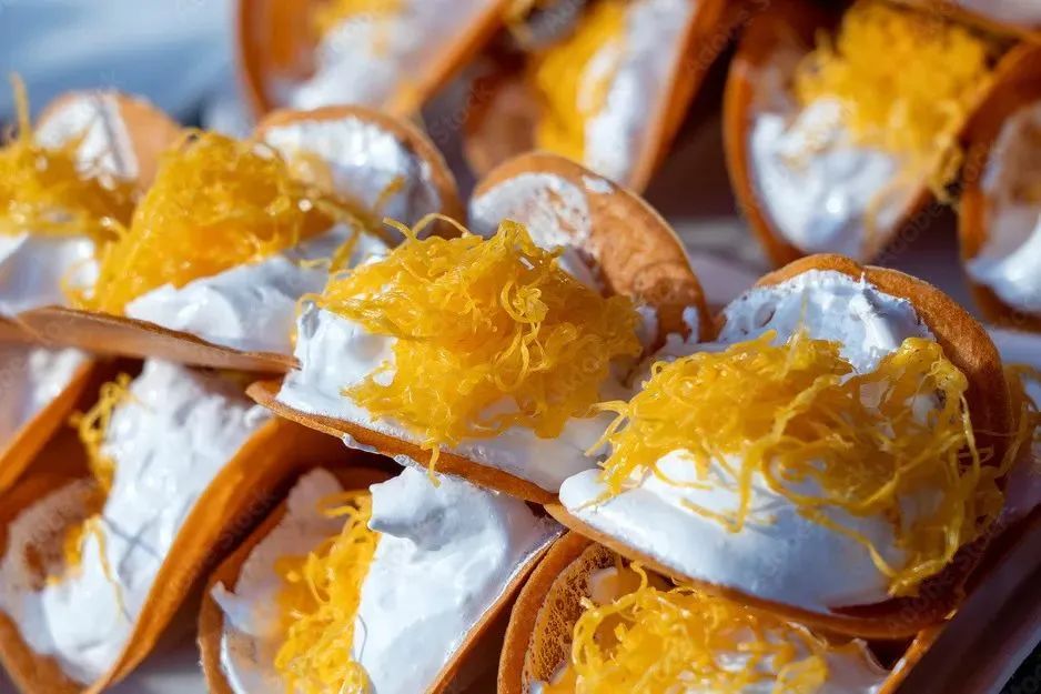泰国有古话“厨房大小锅,必有椰挞煎”。椰丝小脆饼(泰式可丽饼)有600多年历史,分咸甜两种,黄为甜,红为咸。酥脆饼皮配香甜奶霜,椰香四溢,美味无比。常现做现卖,观看制作过程也很有趣。