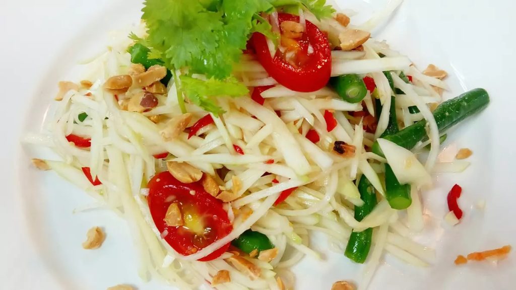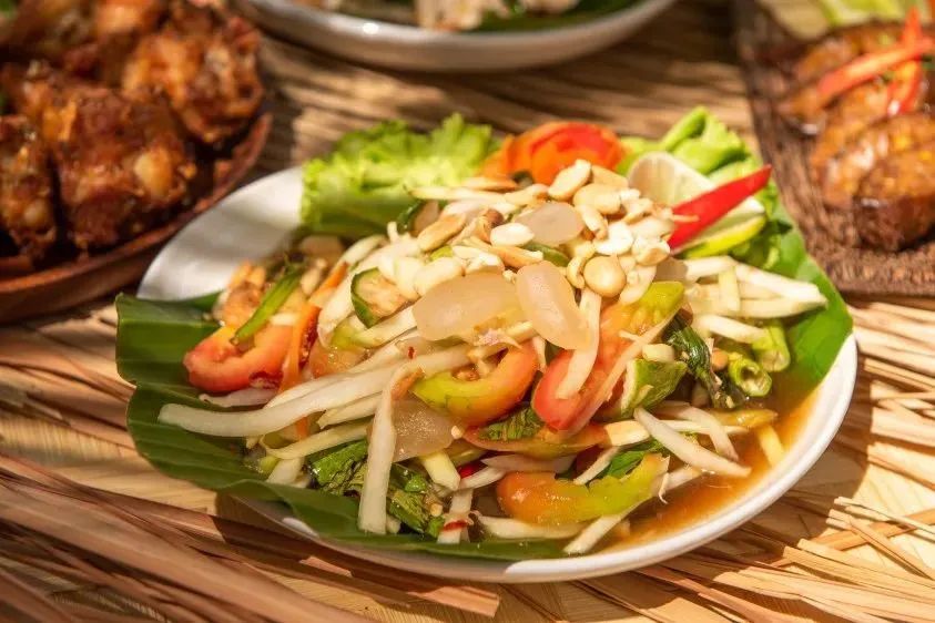 青木瓜沙拉是泰国北方传统菜,以木瓜丝、西红柿、花生为主,加柠檬、辣椒、鱼露调味,有时加海鲜、鸡肉、米粉。常作曼谷餐馆开胃菜,酸甜可口,开胃解腻!