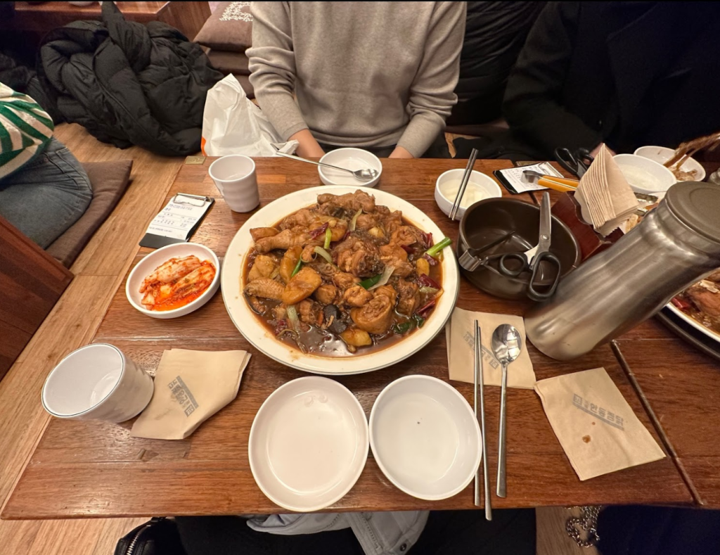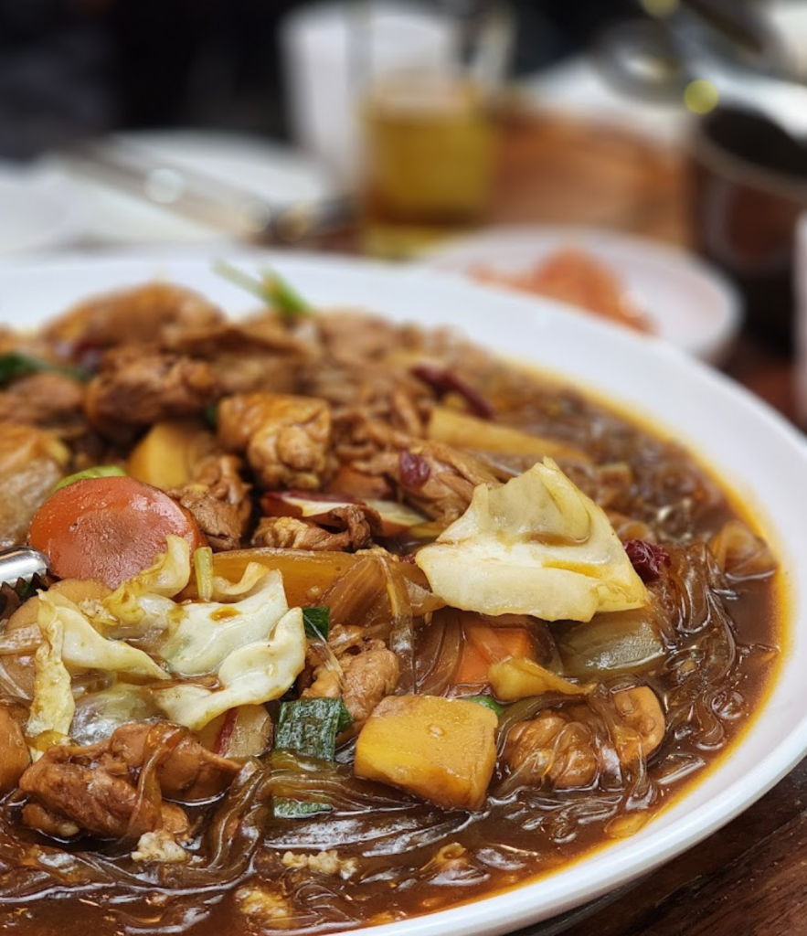 安东鸡煮熟后加入宽粉、土豆、胡萝卜、木耳等蔬菜,再配合着辣椒和大酱一起炖。鸡肉入口即化,酥软入味,蔬菜新鲜滑嫩,宽粉嚼劲十足,超级配饭!除了蔬菜外也有海鲜炖鸡,加入了青口鱿鱼等食材让整份料理更加鲜美。
