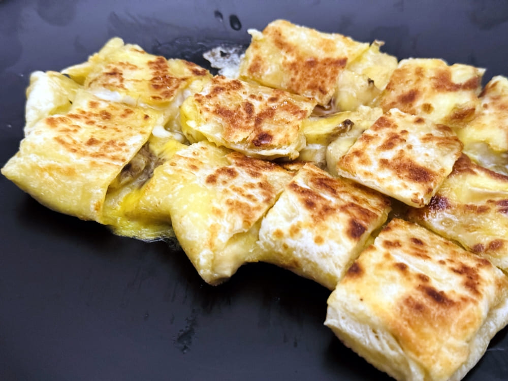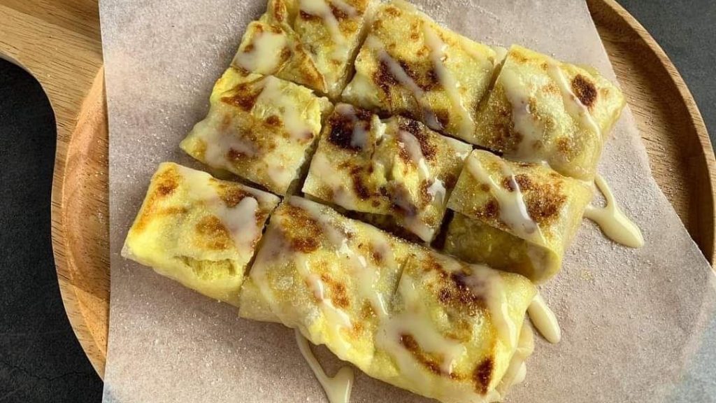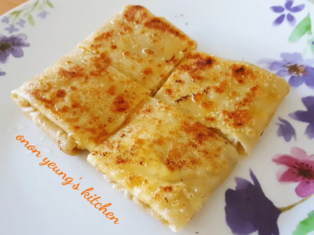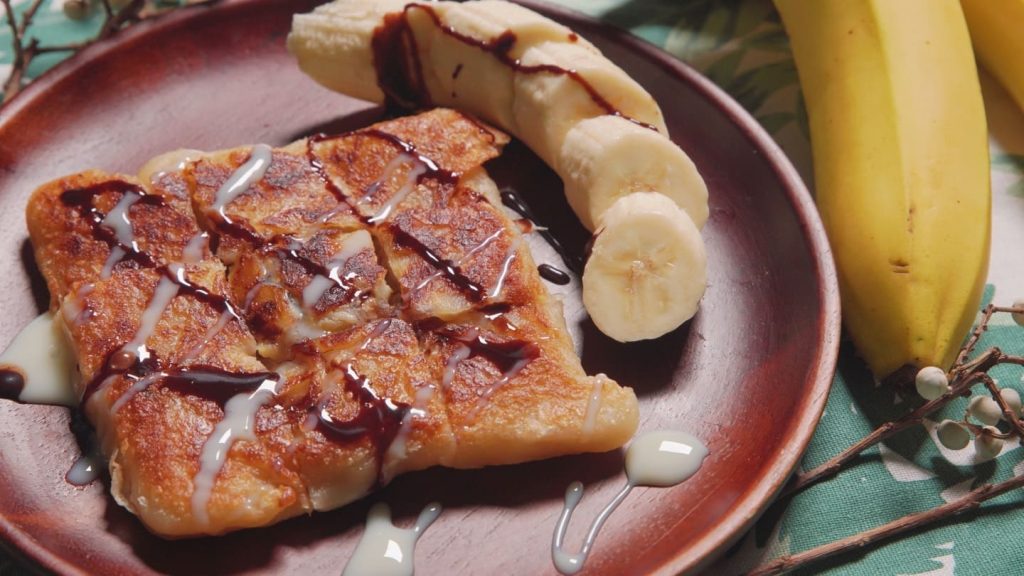 香蕉薄饼,是泰国特色的街头小吃,也是一种美味香甜可口的饭后小甜点。香蕉薄饼的做法是把饼皮反复用力甩在板上使其Q弹,然后用牛油在平底锅中稍微煎一下,加入香蕉,砂糖,等表皮呈现焦香时,迅速起锅淋上炼乳,饼皮的面香再配上香蕉因加热释放出浓浓的果香,吃起来清脆香甜。