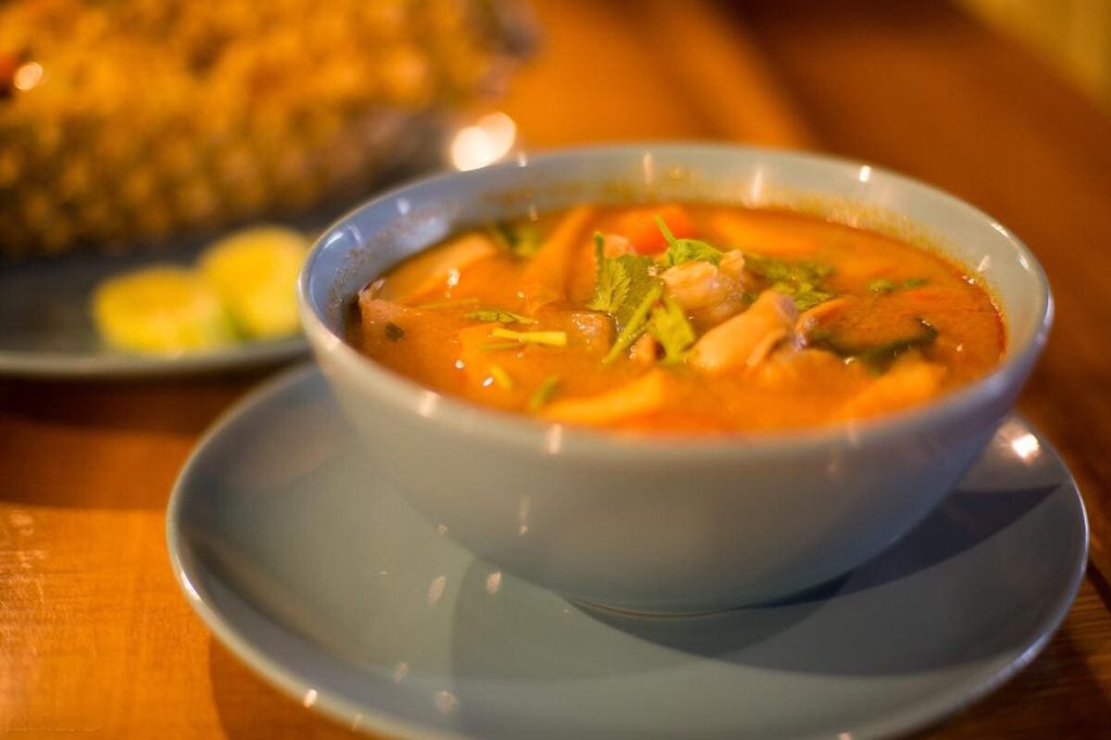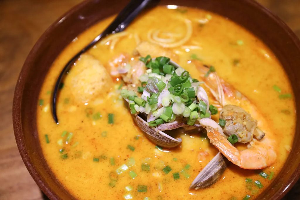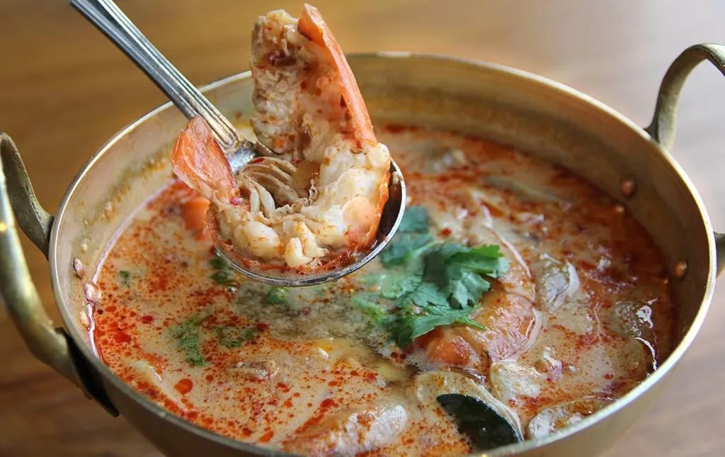 冬阴功汤,又叫东炎汤,冬荫功汤,是一道泰国名汤,典型的泰国菜,是世界十大名汤之一,在泰语中,“冬荫”指酸辣,“功”即是虾,合起来就是酸辣虾汤了。冬阴功汤的特点是采用泰国特有的柠檬叶、香茅、辣椒和虾制作而成,将辅料放入桶煲至出味,而后放入大头虾、鱼露、草菇、花奶、椰汁等一起炖煮,酸味鲜美开胃。冬阴功汤以色泽全红,汤味馥郁可口,辣度十足的为佳。