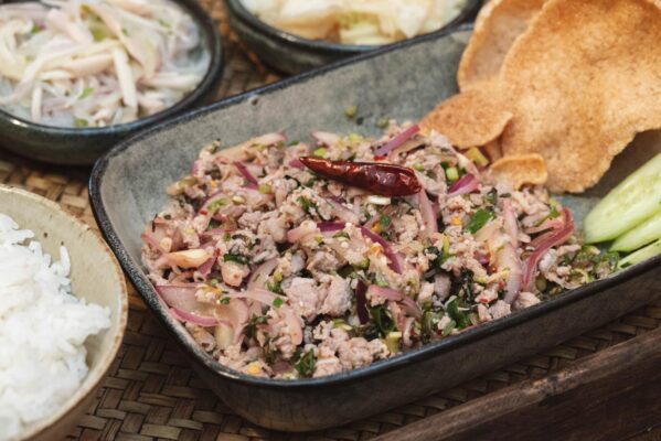 泰北酸肉,起源于泰国东北,将猪肉和糯米混合,待发酵后拿到炭火上去烤。大部分人在刚吃时会对那微酸的味道非常不习惯,以为吃到了腐坏的香肠,但泰北酸肉的奥妙就在这里,微微发酵的味道,正是它的美味所在,就像中国人的臭豆腐,多吃几口就会让你上瘾,恨不得天天吃。