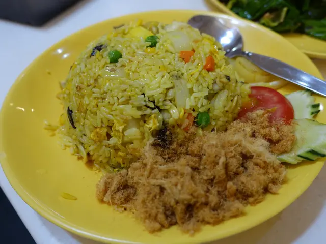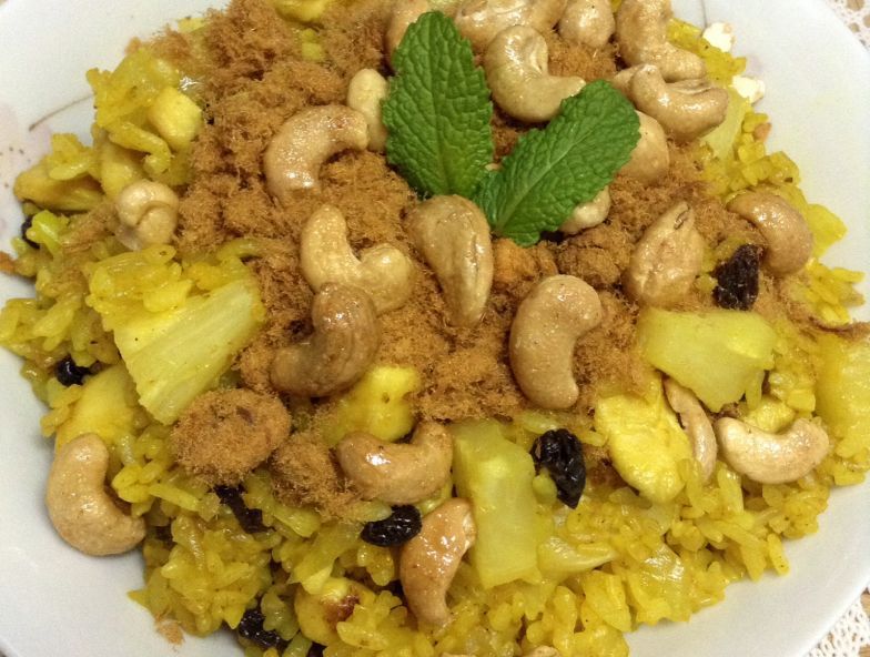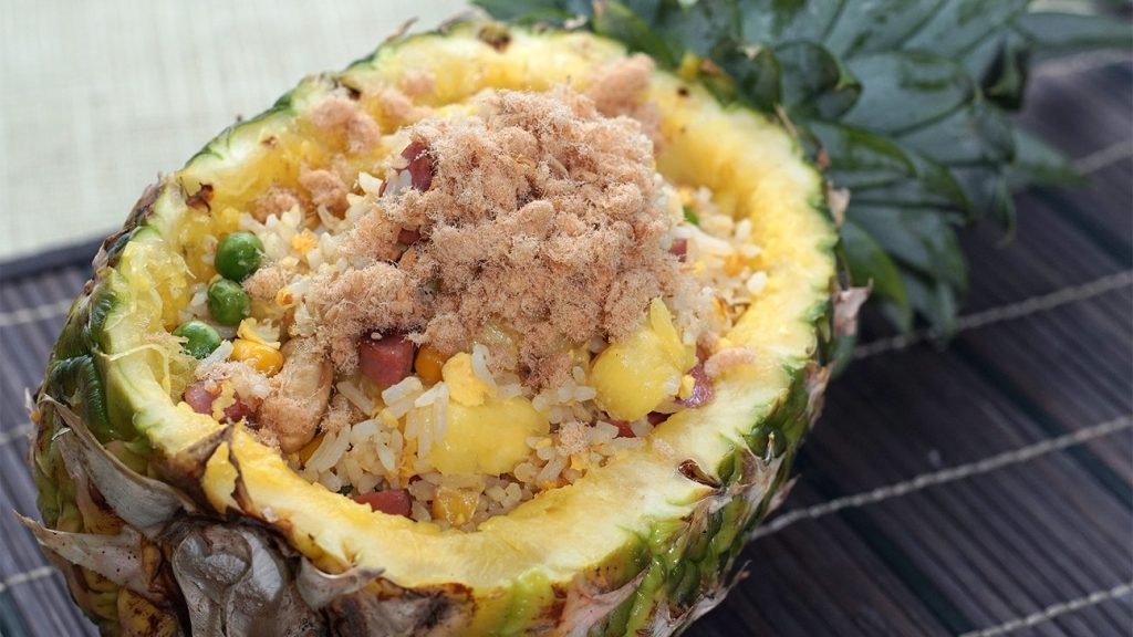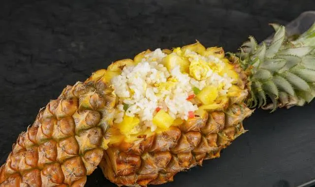 菠萝炒饭,是泰国的一道经典菜,也是泰国比较常见的主食。泰式菠萝炒饭,又被称为凤梨炒饭,主要原料是大米和菠萝。制作菠萝炒饭的大米最好用泰国香米。在炒饭之前先把泰国香米蒸熟,蒸的时候要蒸得干一些,把肉厚汁多的菠萝切块之后,与泰国香米饭、火腿、鸡蛋、新鲜蔬菜等一起在油锅中翻炒,放入带有咖喱的炒饭中,既有菠萝的酸酸甜甜,又有咖喱的独特风味,便成了一盘口感丰富的菠萝炒饭。更讲究一些的话,把炒饭放在半边菠萝壳上,再撒上熟腰果,这就是最家常的泰式风味。