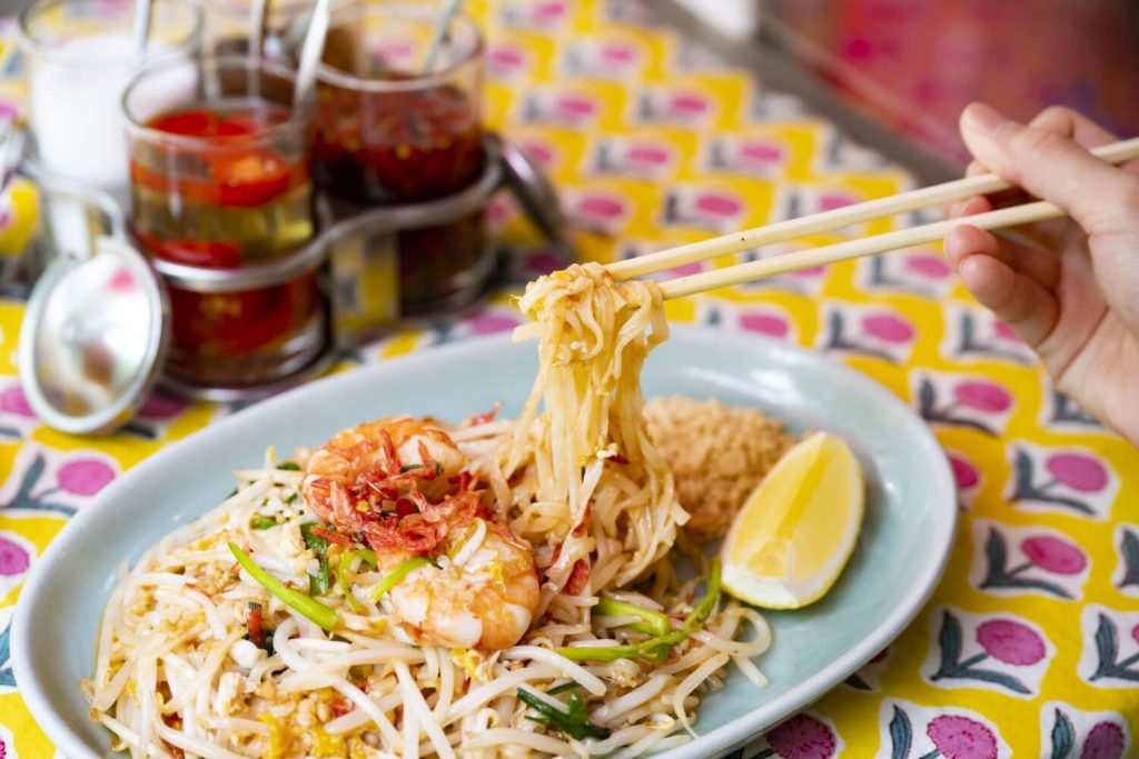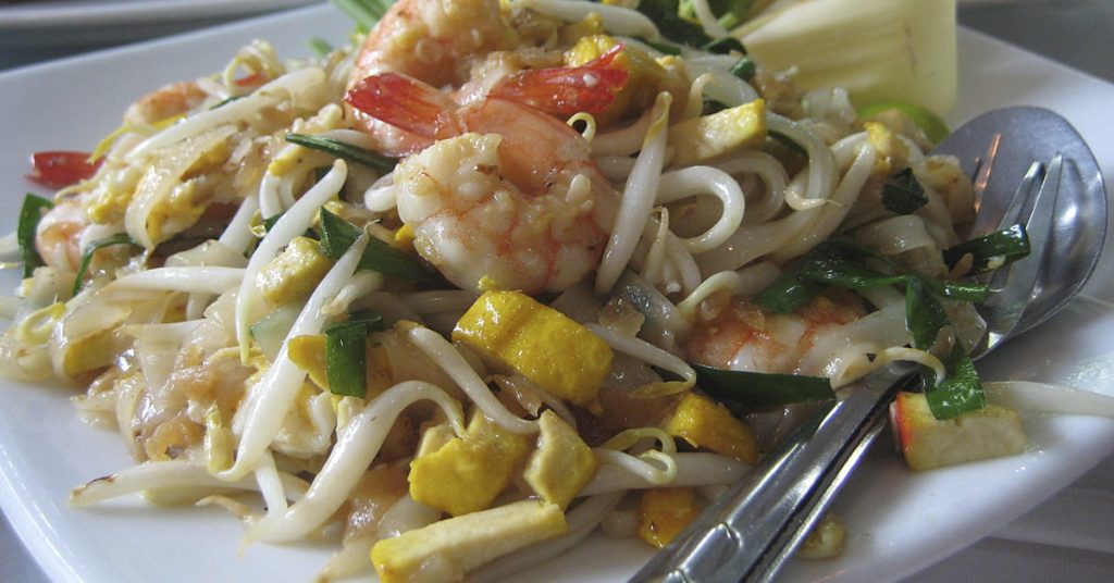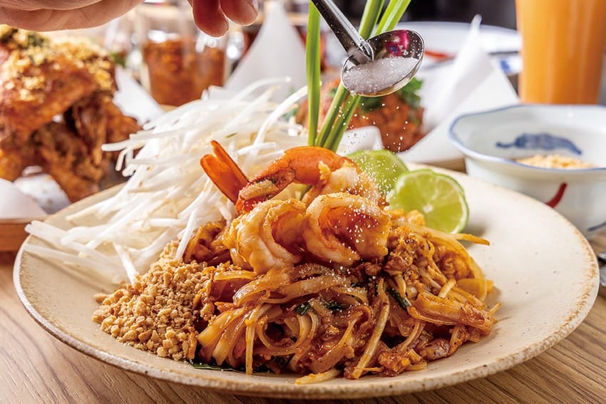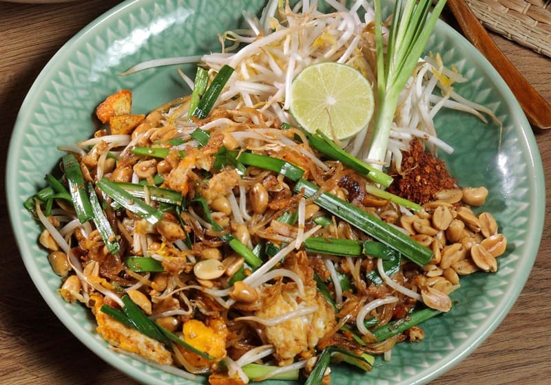 炒河粉,是比较有代表的泰国菜,也是泰国接头常见的美食,融合了咸、甜、酸、辣四种独特风味。泰式炒河粉的做法是河粉用温水泡软,豆腐干切小片,韭菜切段,花生放食品袋用刀背拍得碎碎的;鸡蛋打碎,用油炒熟,放下虾仁豆腐干绿豆芽翻炒,倒入河粉,淋老抽,小火炒至上色;加入2大勺的泰式甜辣酱,再加入韭菜和花生碎,转大火翻炒一下就可装盘。