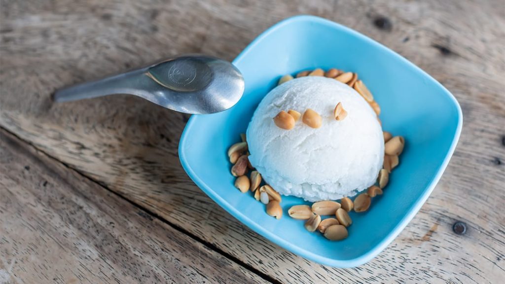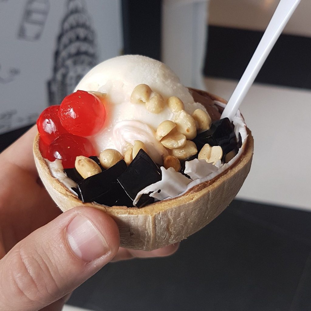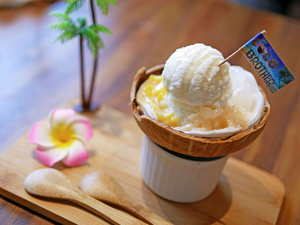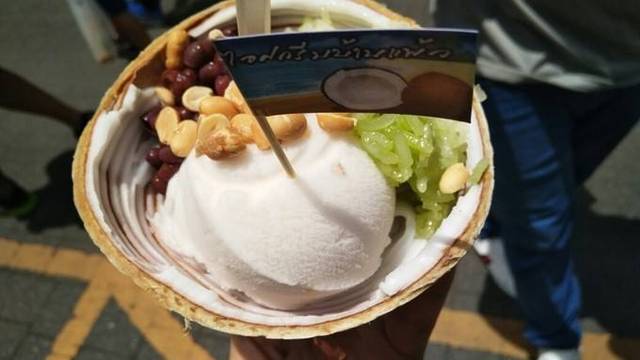 椰子冰淇淋,是泰国的一道甜品,主要食材是椰子汁,正宗的椰子冰淇淋乳白色,有奶油椰子香味,冰凉爽口,入口即化。椰子冰淇淋的做法是把椰子切成两半以后再把里面的椰子捣碎,然后加一些冰进去,再放入冰淇淋即可,非常简单。当然现在有很多小配料可以适量添加,口感也是相对不错的。
