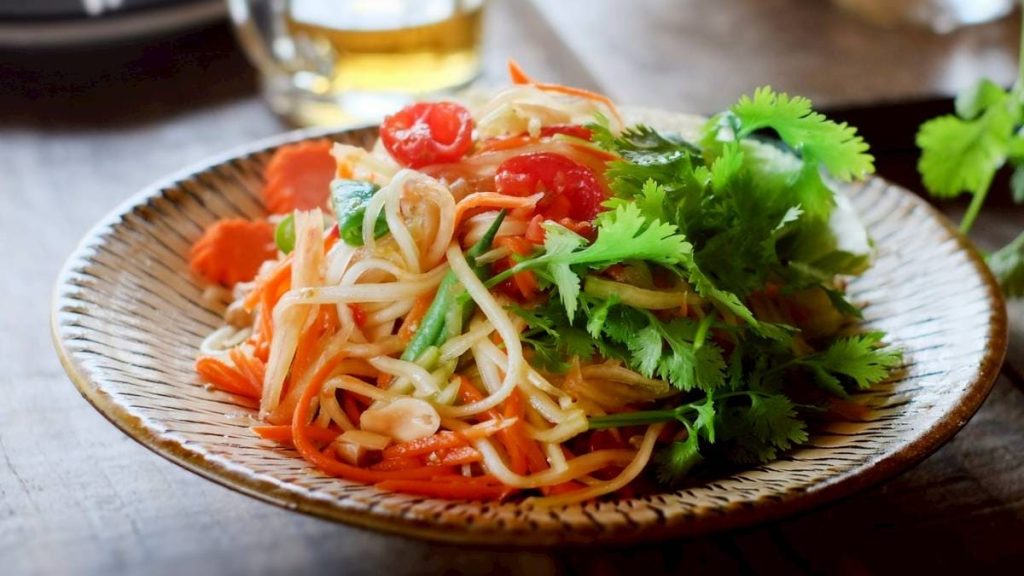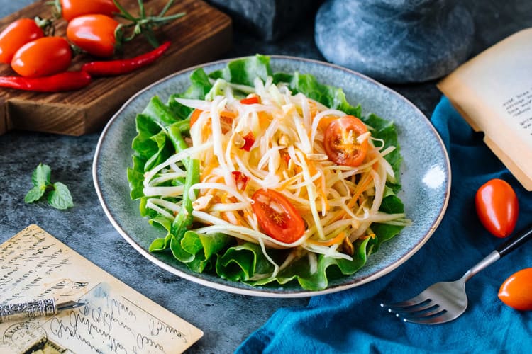 青木瓜沙拉,是泰国的特色美食,主料是青木瓜、柿子椒、蒜泥、红辣椒、鱼露、苹果醋、柠檬、盐等。做这道菜一定要选没有熟透的青木瓜,青木瓜与熟透的木瓜相比不仅口感清爽,而且营养更加丰富,含较多木瓜酵素,不仅可分解蛋白质、糖类,更可分解脂肪,加上木瓜酶助消化能力,能够尽快排出体内毒素,促进肌肤代谢,因此,青木瓜沙拉受到很多爱美人士的喜爱。